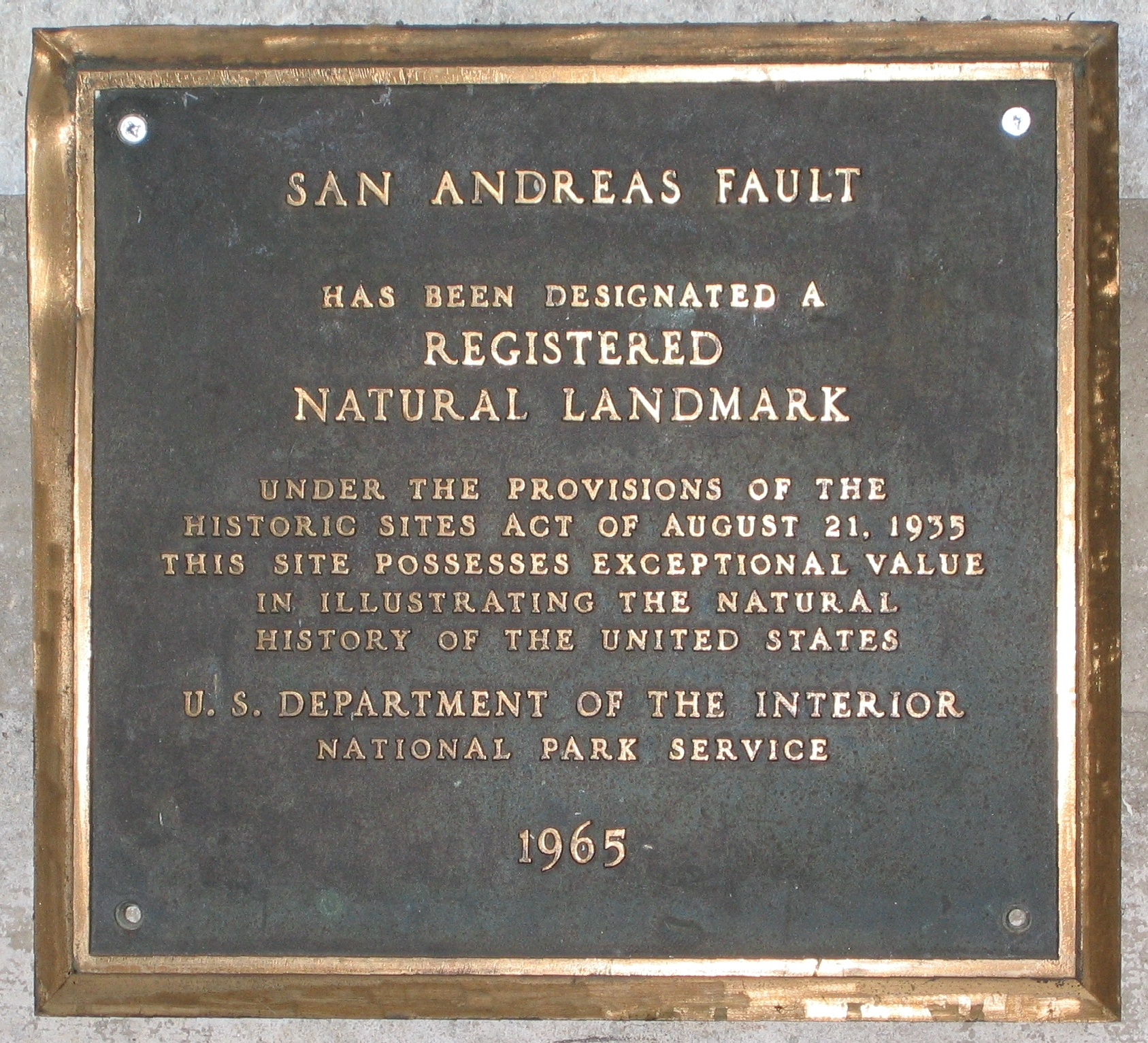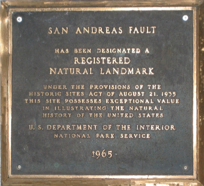 Map of California showing the SAF, Natural Landmark plaque and the Field Guide to the San Andreas Fault.